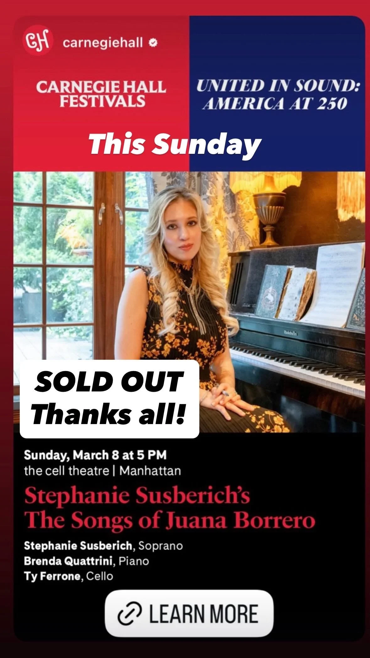 On March 8, 2026 (International Women’s Day), she presented a sold-out performance of her song cycle Songs of Juana Borrero at the cell theatre in Chelsea as part of Carnegie Hall’s city-wide United in Sound: America at 250 Festival, in a program presented by the Cuban Cultural Center and marking the 130th anniversary of the poet’s death. The recording of the cycle was released as her debut album, Songs of Juana Borrero, issued on Composers Concordance Records on March 6, 2026, with cover artwork by the Cuban painter Hector Frank.
